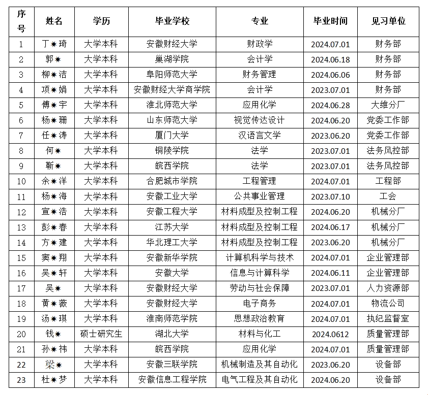 为认真落实省国资委、省委宣传部、省财政厅和人社厅《关于做好2024年安徽省国有企业就业见习工作的通知》(皖国资考分[2024]70号)精神,乐天堂fun88集团公开招募大学生就业见习,经公司相关单位筛选确定,23名见习生基本信息对外公示,公示期5天(2024年9月5日至9月9日),接受社会监督。监督电话:0551-82189867,0551-82189811。